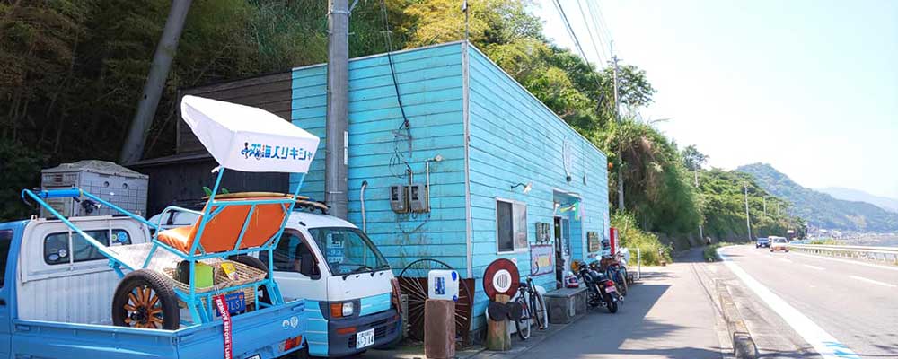 夕やけこやけライン沿い、ふたみシーサイド公園の2.2km北に佇む水色の建物【海アフロPOST】。「愛媛湘南化プロジェクト広報活動」、「ラジオ番組専用スタジオ」を主たる活動とする、愛媛湘南化プロジェクトの拠点です。海や湘南に関する雑貨も取り扱っています。愛媛県伊予市双海町高野川甲36